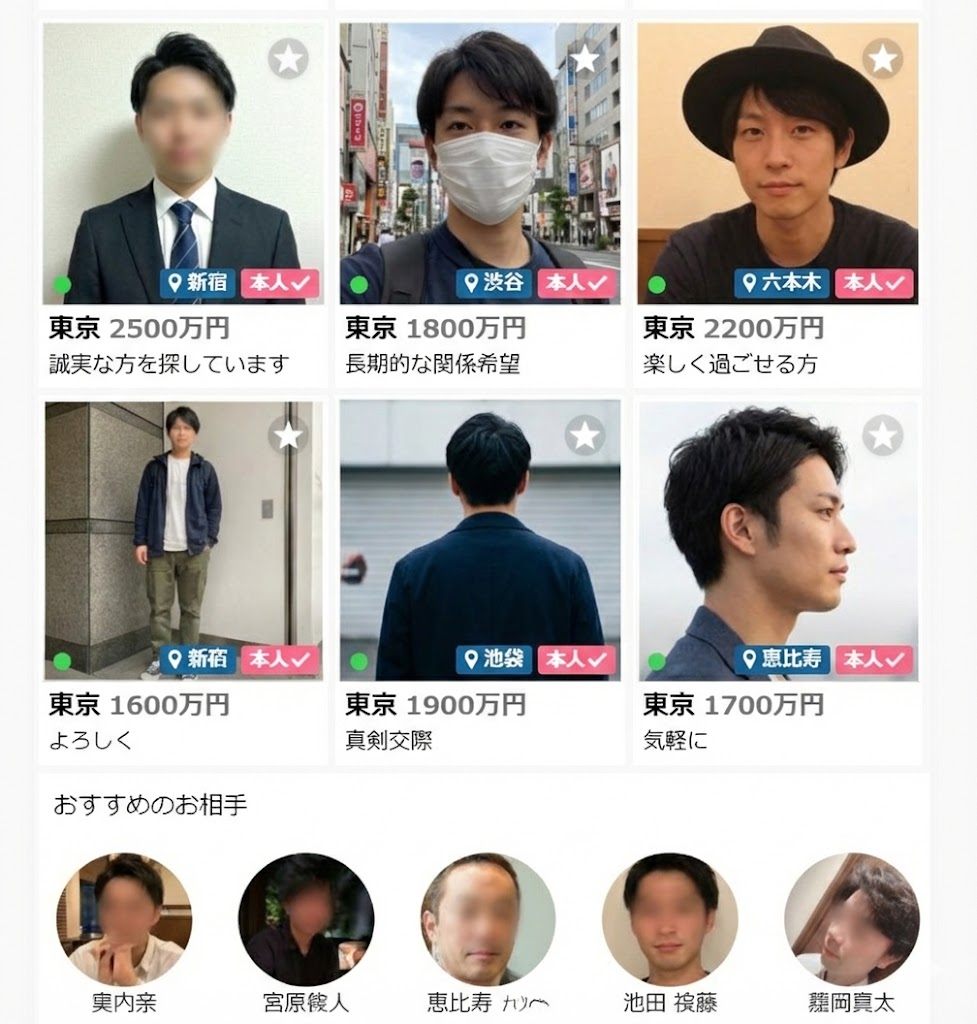 年収証明を通過したハイクラス男性が多くて、「変な人に当たるリスクを減らしたい」という初心者にとって、はじめの一歩に最適です。